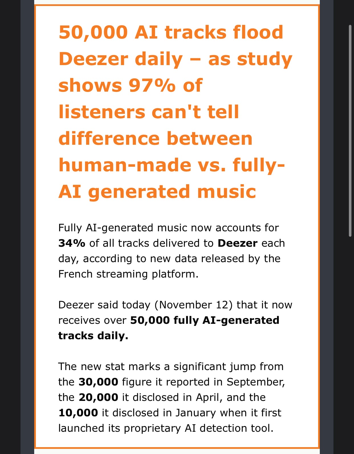 27 Nov 2025 AI Music on Deezer From MBW:Time will tell whether Deezer does something about this flood of AI slop. Jay Peach