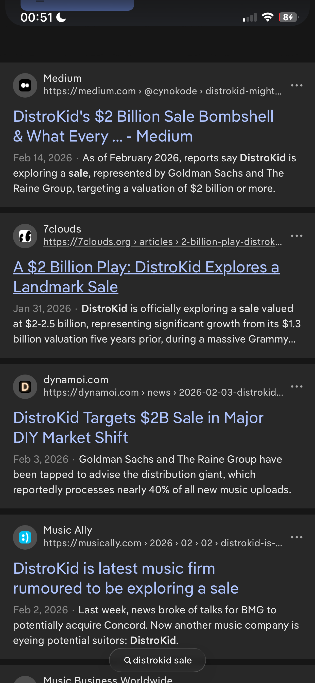 But as you may have read, there’s a number of analyses of DistroKid’s potential sale. see this screenshot of DuckDuckGo’s search page for the prompt “DistroKid sale”.