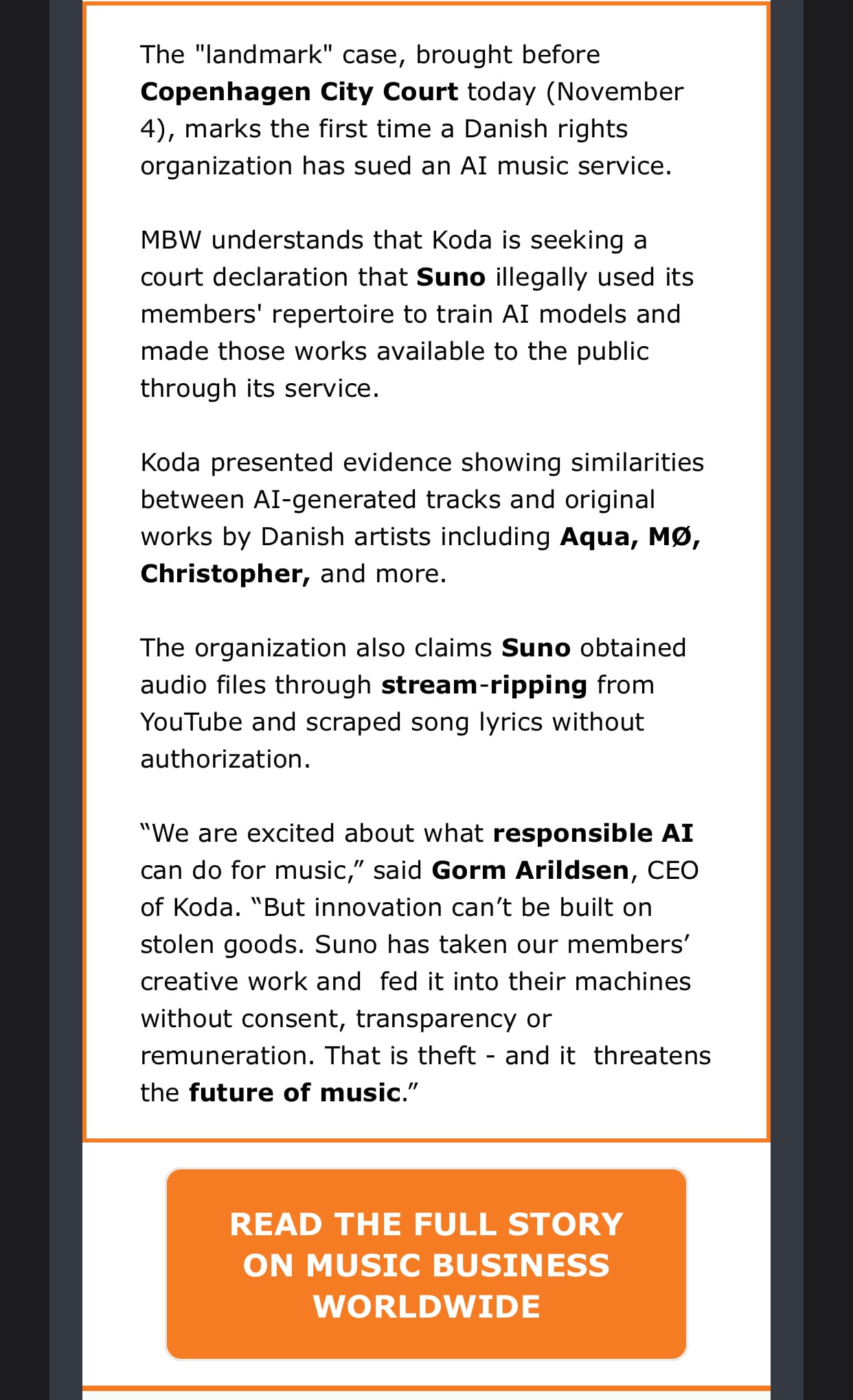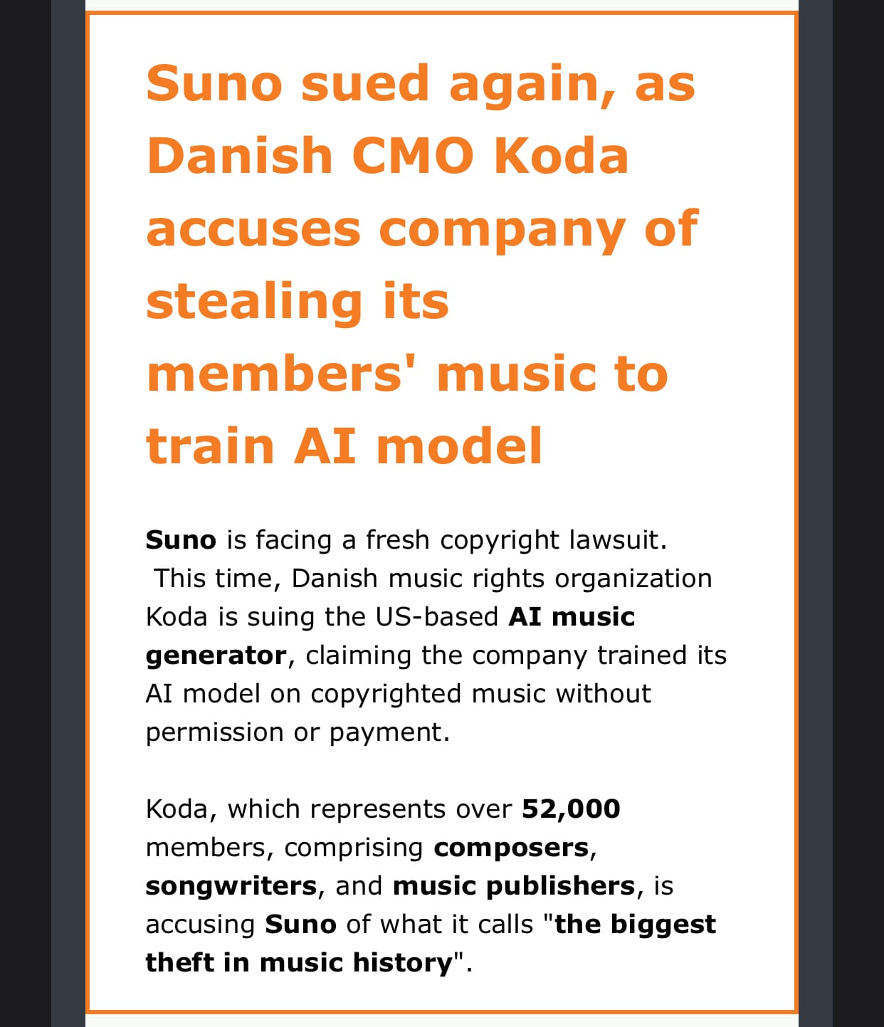 21 Nov 2025 Suno Sued Again, This Time in Denmark From MBW:Looks like Suno is in more hot water. I guess Udio isn’t involved this time, though maybe lets se if more suits get filed. Jay Peach