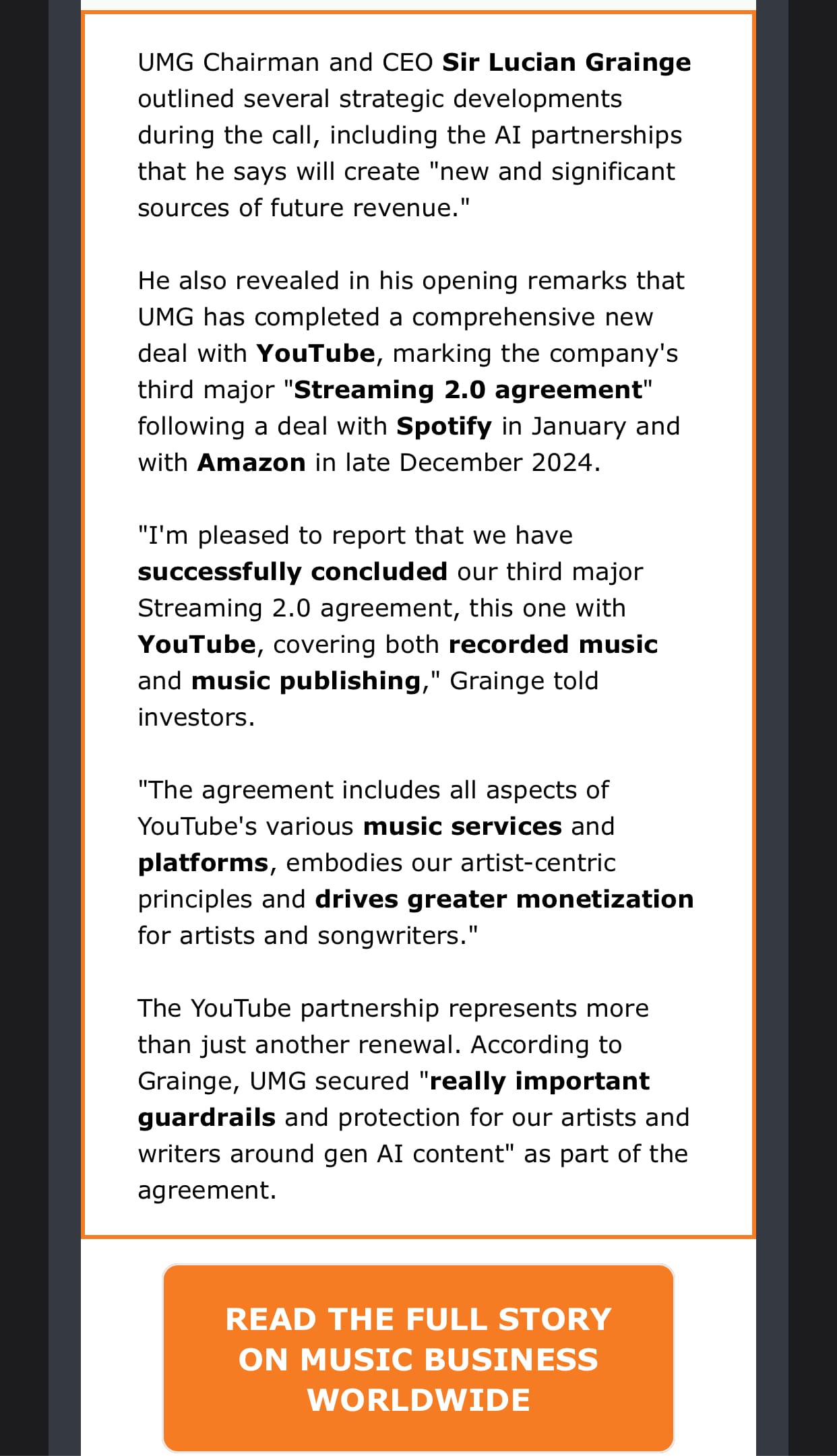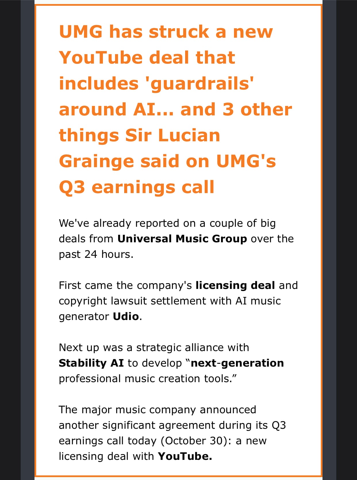 21 Nov 2025 UMG Again, This Time With YouTube Again from MBW:Lets see if UMG has more magic up its sleeves. Do you think all these AI collaborations are going to benefit artists? Jay Peach