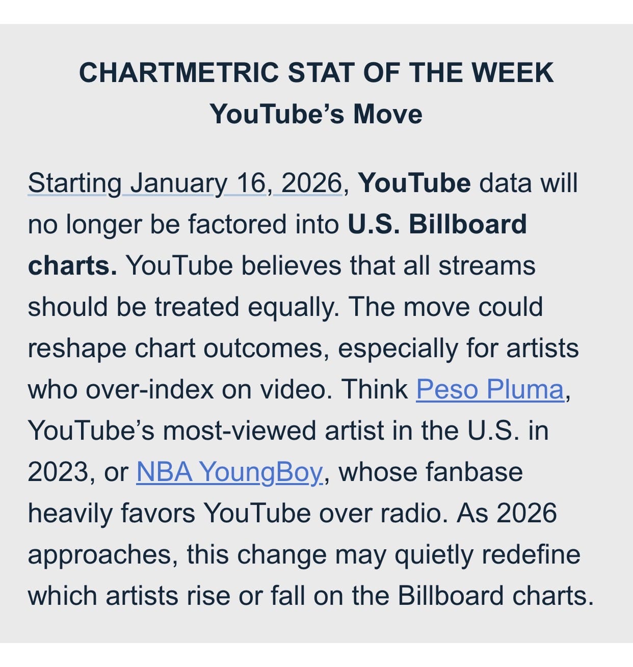 15 Jan 2026 YouTube Not Counted by Billboard I know this isn’t a concern of most indie artists, but there’s this news from Chartmetric:Does this concern you? I mean, do you publish YouTube videos or music? Jay Peach